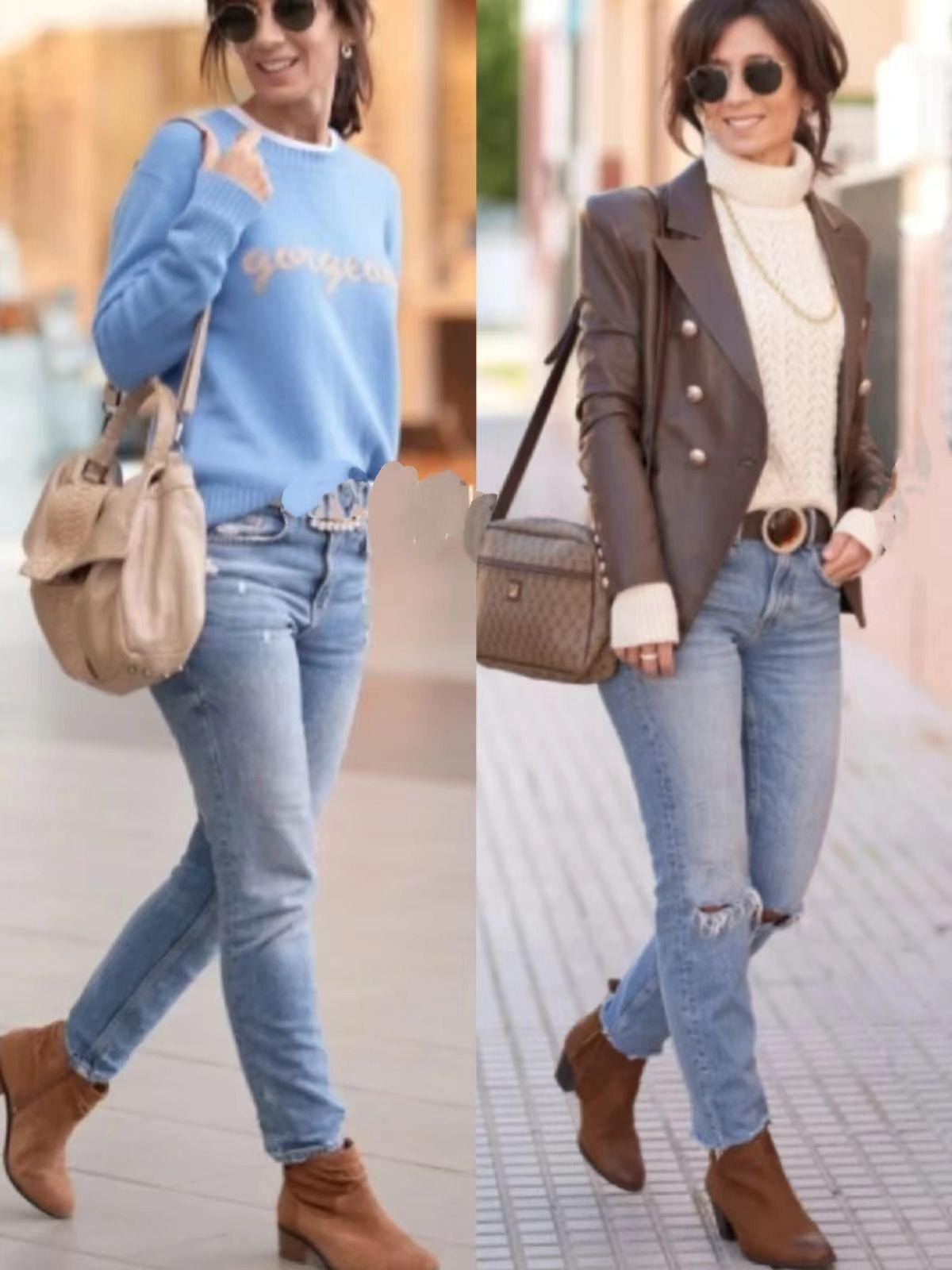 除了九分款式,長度蓋住二分之一靴面的藍色直筒牛仔褲、微喇牛仔褲也可以安排起來,搭配毛衣或者襯衫、棉服、西服,都很高級氣質。