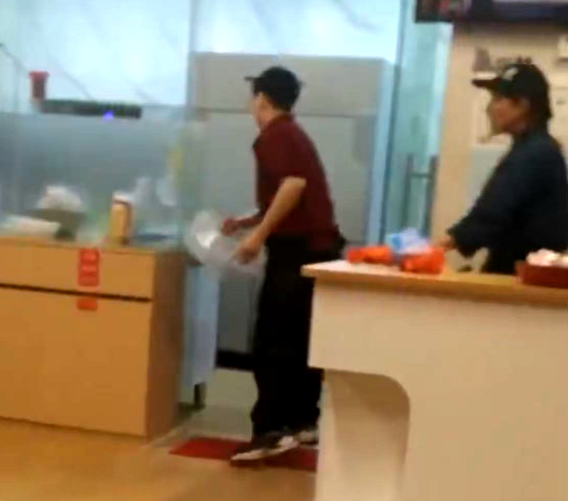 看畫面網友應該是偷拍,麥家琪像平常一樣,在店裡面工作,跟店員聊天。