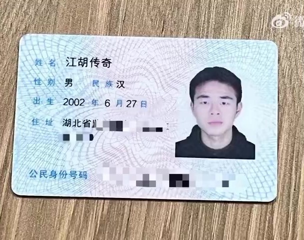 一名來自湖北武漢的21歲男大生日前曬出自己的身分證,只見他的名字就叫「江胡傳奇」,讓人一眼難忘,他表示自己是獨生子,從出生就叫這個名字,可能是媽媽懷他時,爸爸喜歡玩手機遊戲《傳奇》,所以就給他取了這個名字,希望他也能擁有傳奇人生吧。