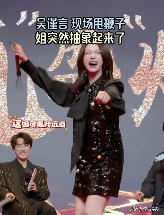吳謹言的新劇《春花焰》上映了,吳謹言為宣傳新劇,在舞台上豪邁、霸氣甩鞭子的場景火了。