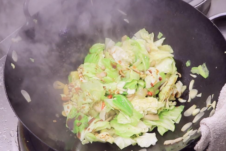 3、包菜斷生后,加1勺生抽、2g鹽、1g胡椒粉、少許白糖,炒熟。出鍋前,沿著鍋邊淋入少許明油來提亮菜的顏色,然後再加一勺雞精持續翻炒一會就可以裝盤食用了。