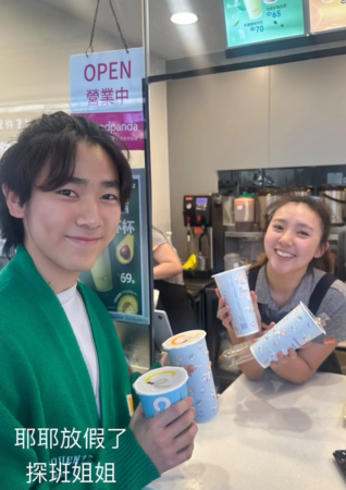 照片中可見樂樂穿著灰色上衣搭配黑色圍裙,雙手捧著兩杯手搖飲料,站在知名連鎖飲料店櫃台前展露燦爛笑顏。更溫馨的是,正值假期的弟弟耶耶還專程到姊姊工作的門市探班,姊弟倆同框互動流露出濃厚情誼。