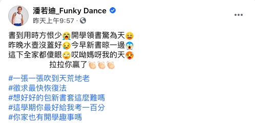 潘若迪也在臉書上發文直呼:「書到用時方恨少,開學領書驚為天!」笑說全家都敗給女兒了,更要她這學期都考一百分,才不枉費大家忙碌一場,不少網友看到後也笑翻:「孩子總是讓人驚奇耶!」、「每個開學日,都是爸媽崩潰的日子!」