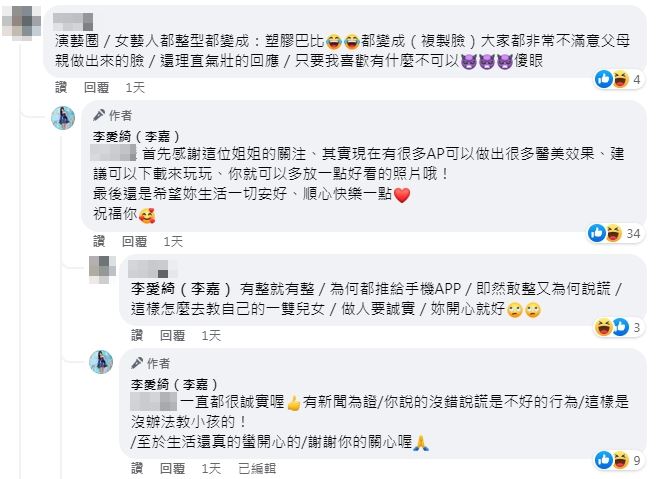 對於大家的酸言酸語,李愛綺親上火線回應,高EQ喊話:「其實現在有很多APP可以做出很多醫美效果,建議可以下載來玩玩。」感謝對方的關注,也推薦對方可以試試,最後也祝福對方生活一切安好、順心快樂,本以為這件事這樣就解決了,怎料對方不甘示弱再回嗆,狠酸她「有整就有整」,何必推給手機APP,更扯到李愛綺一對兒女:「即然敢整又為何說謊,這樣怎麼去教自己的一雙兒女?」