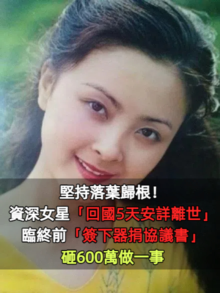 旅美多年!資深女星「堅持落葉歸根」回國5天安詳離世 死前「砸600萬做1事」眾人淚目
