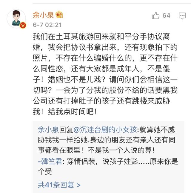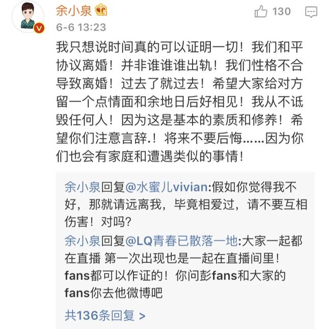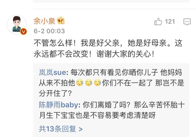只不過在評論區,余小泉承認了離婚,但表示何承熹是好媽媽,他是好爸爸,離婚是因為性格不合,並非同性戀等說辭: