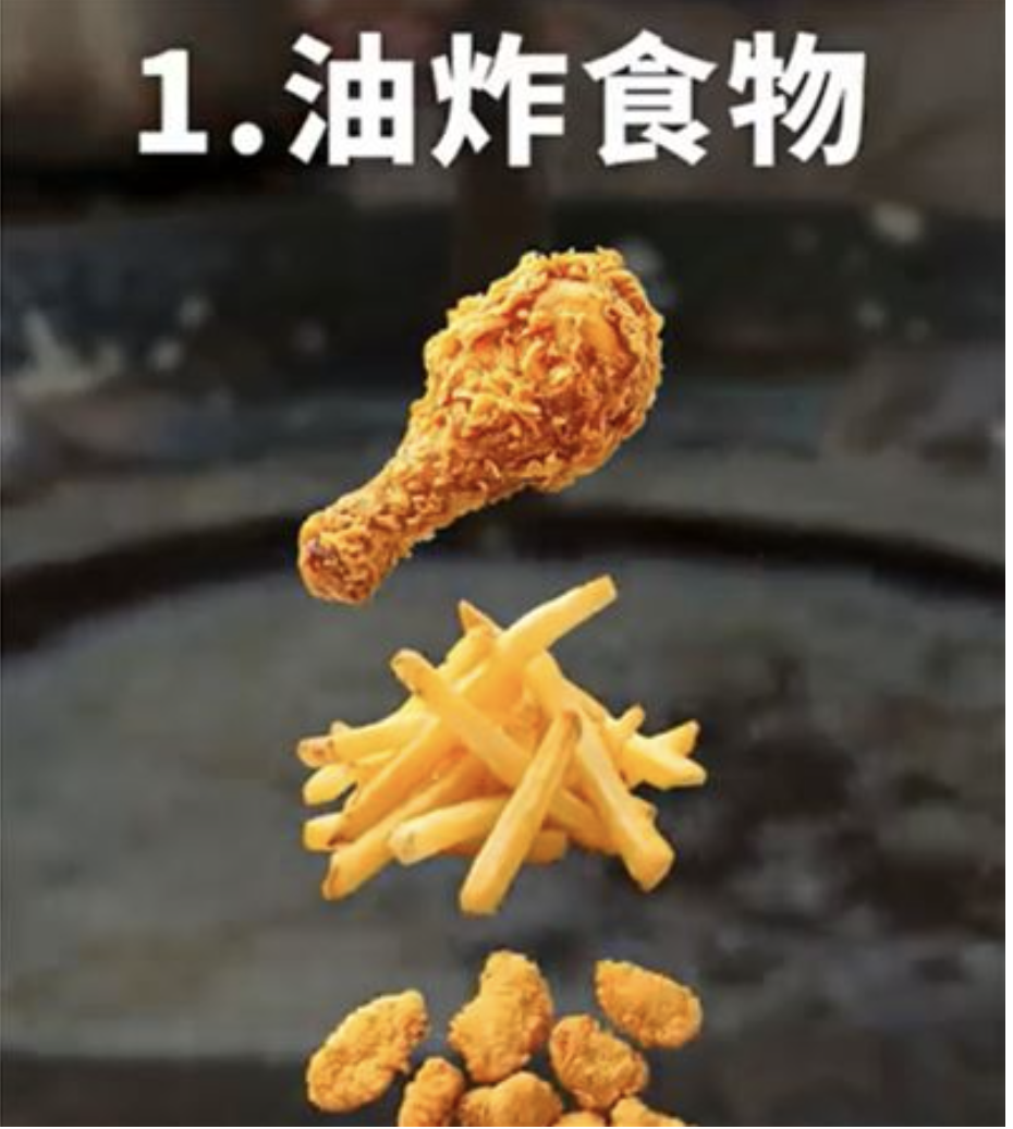 首先是油炸類製品,像是炸雞、薯條與鹹酥雞等。陳醫師解釋,研究資料顯示,經常攝取油炸品跟心血管疾病還有第二型糖尿病的風險有正向關聯。