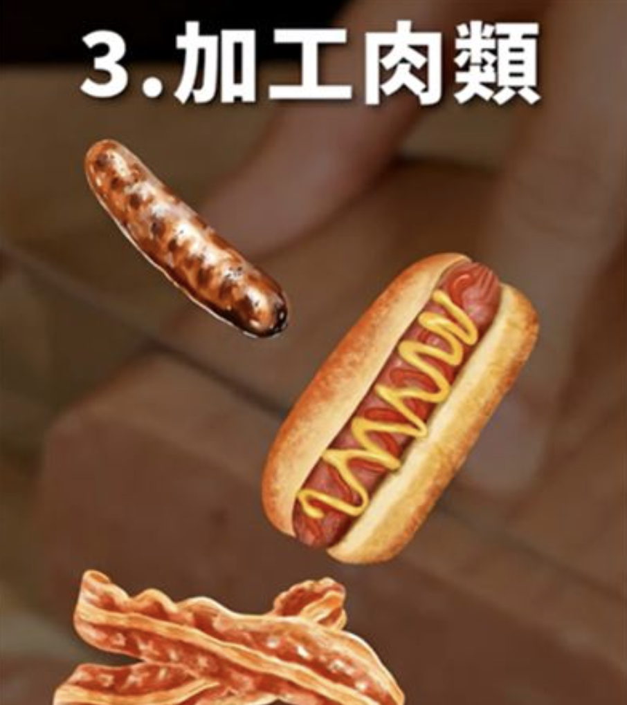 第三類則是加工肉品,包含香腸、熱狗跟培根等製品。陳醫師說明,加工肉品已被世界衛生組織歸類為「第一級致癌物」!每日只要多吃五十公克加工肉,大概是一條熱狗的分量,罹患大腸癌的機率就會提升18%。