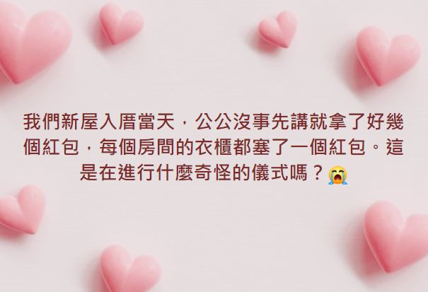 據《三立新聞》報導,原PO一家有幸買下新房,近期開心地舉辦入厝、公公也到場,「沒事先講就拿了好幾個紅包,每個房間衣櫃都塞一個,這是什麼奇怪的儀式?」原PO深感好奇,希望大家能幫忙解惑,對此,網友們熱烈回應:「讓你們住新屋聚財,不是壞事,阿嬤也這樣教我!」、「希望能為家裡帶財,某些地方習俗。」、「要妳財源滾滾,我們是壓母錢~」