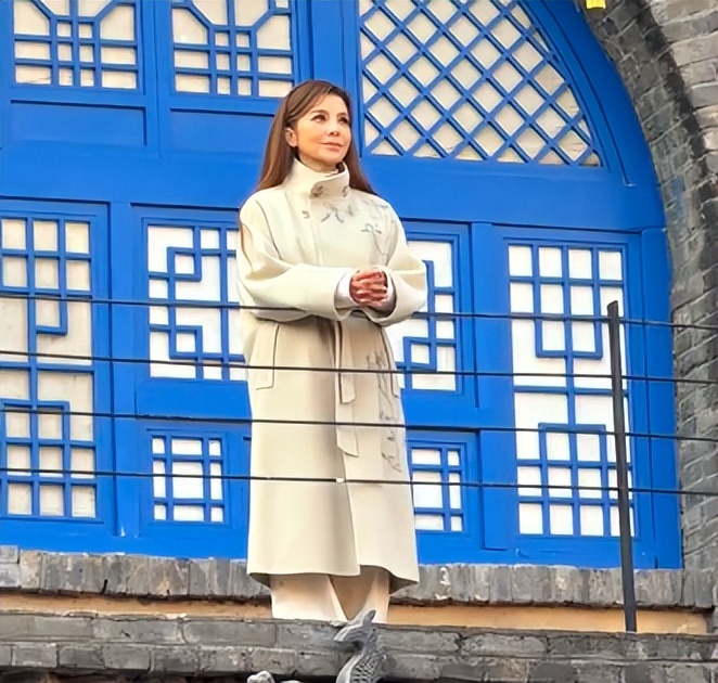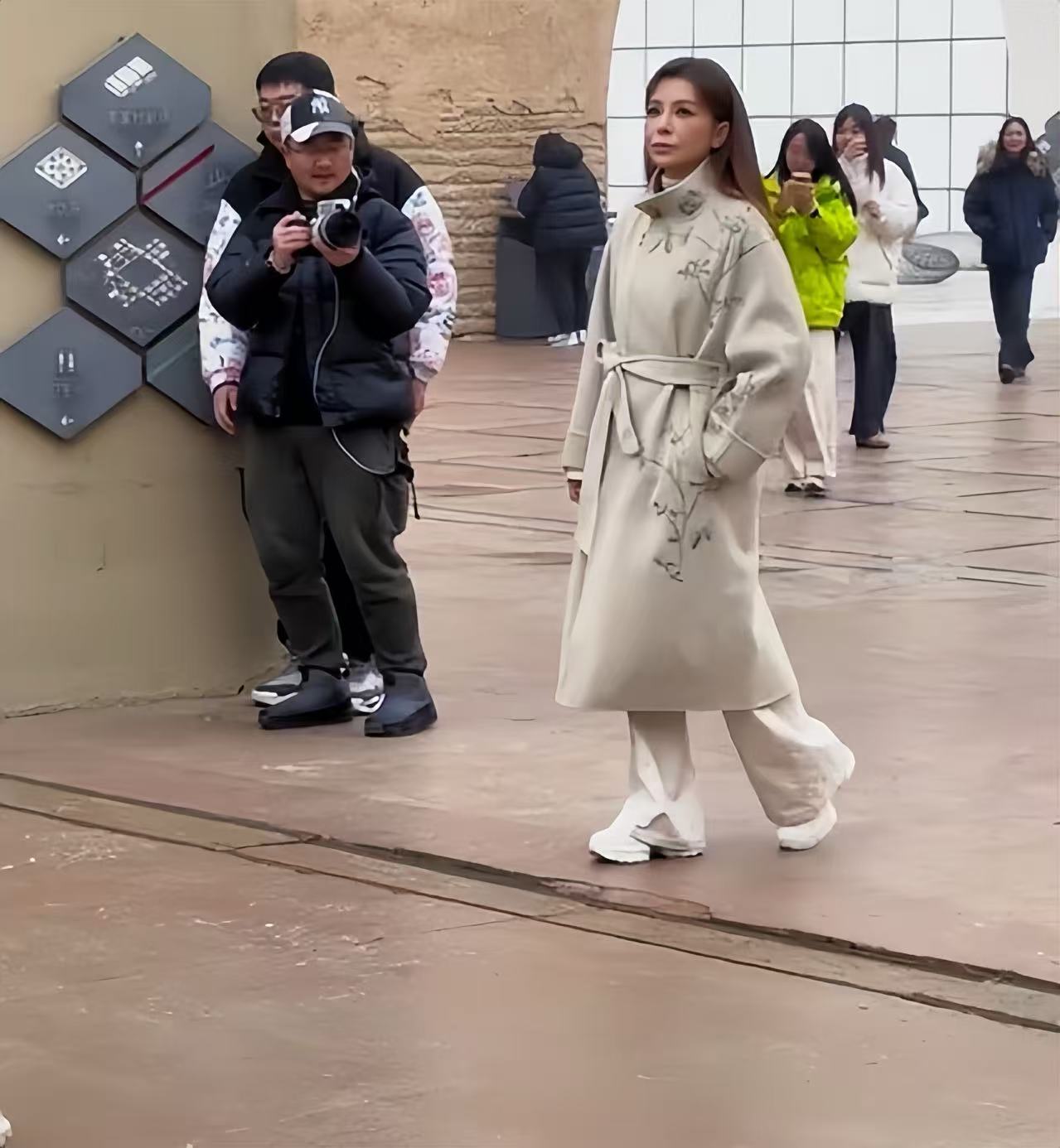 她身穿單薄刺繡米色大衣,搭配寬鬆白色褲子和厚底鞋,一身穿搭看起來有點臃腫,但因為沒穿羽絨服,所以整體看起來還是比較清冷的。