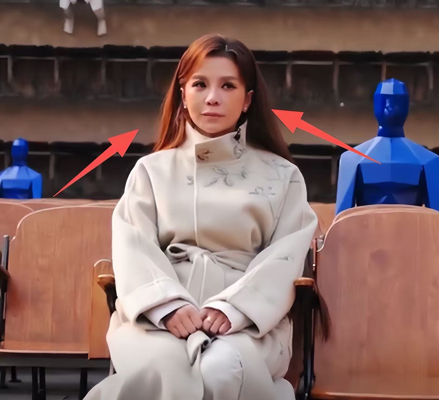 這次她罕見地沒有裝嫩,妝容清淡,頭髮就是簡單的披肩髮,配上白色大衣,氣質優雅,就像出自書香門第的大小姐。