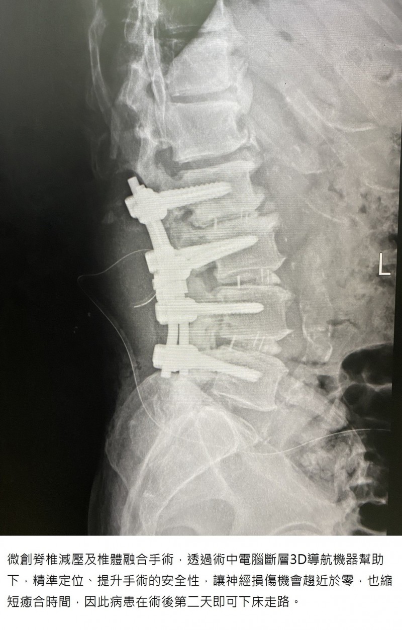 對於這門快速見效的新型手術,楊醫師也分享它與傳統手術的差別,「傳統的椎體融合手術,是靠X光機做判斷因此神經損傷風險高...」但現在的新型微創脊椎減壓及椎體融合手術,「是在術中電腦斷層3D導航機器幫助下,能精準定位、提升手術的安全性,讓神經損傷機會趨近於零,也縮短癒合時間,因此病患在術後第2天即可下床走路!」
