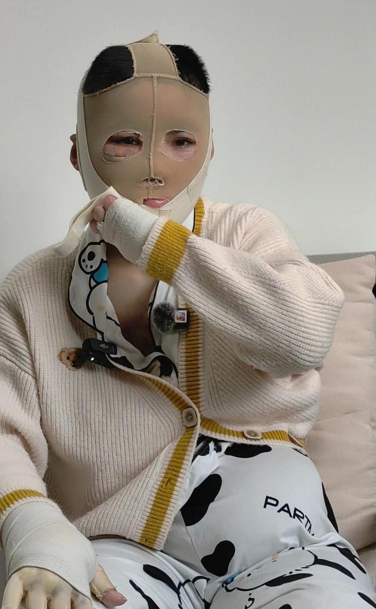 4月21日,海報新聞記者在恩施見到了28歲的受害者陳女士,她的頭部裹著壓力面罩,左手虎口、指關節都已截肢,身上留有大面積疤痕。為了準備下一次植皮手術,她必須在左腹部注射大量生理食鹽水,對皮膚進行擴張。