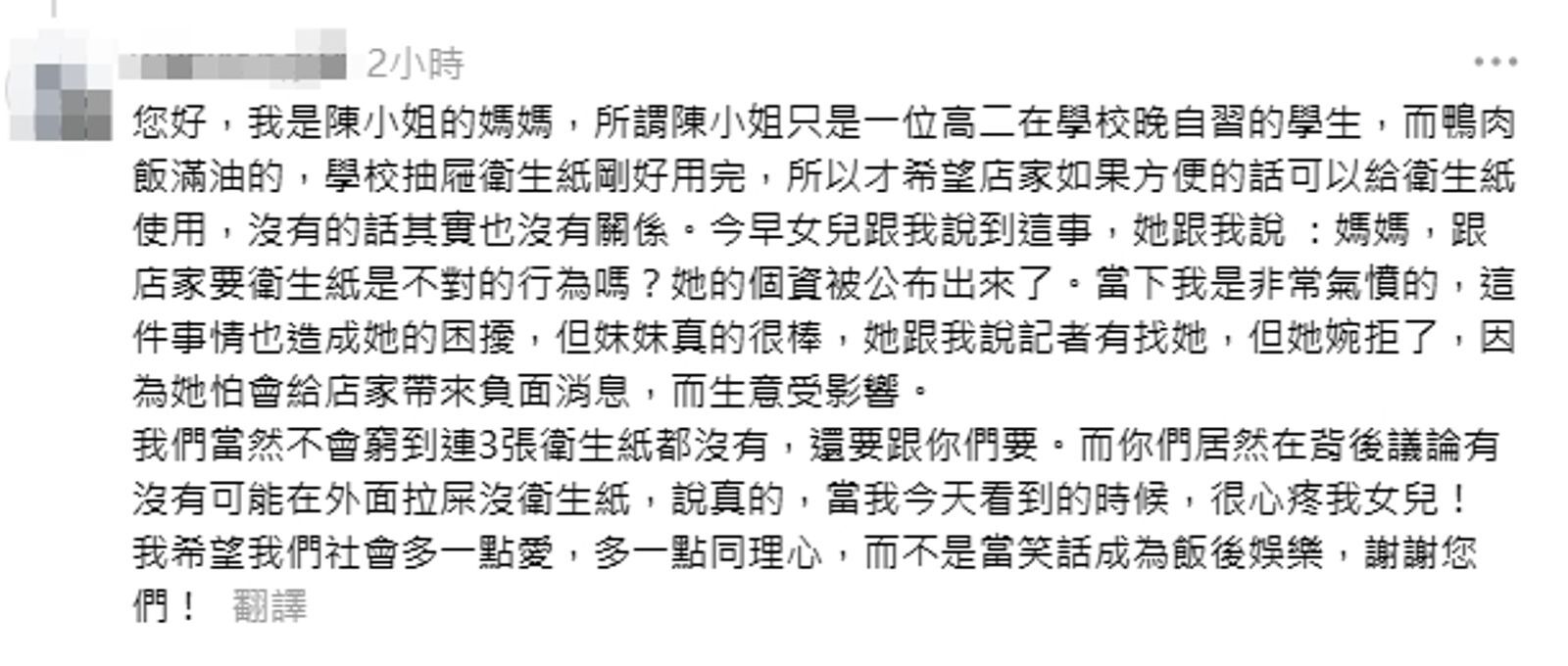 陳母心疼表示,女兒早上問她「跟店家要衛生紙是不對的行為嗎」,讓她聽了相當難過。她也提到,女兒收到媒體採訪邀約時選擇婉拒,因為擔心會給店家帶來負面影響、衝擊生意。陳母最後呼籲「希望社會多一點愛、多一點同理心,而不是當笑話成為飯後娛樂」,此番言論獲得大批網友力挺。網友紛紛留言痛批店員「客人已經很客氣了還被當笑話」、「公開個資真的太超過」、「三張衛生紙而已有這麼難嗎」、「店員心態有問題」、「女學生好懂事,店員該好好學習」。