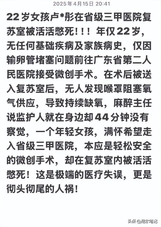 一個這麼年輕、這麼好看的女孩,只是為了想要一個寶寶前往廣東省第二人民醫院做輸卵管微創,沒想到最後因為監護醫生的疏忽幾乎被活活悶死在恢復室。