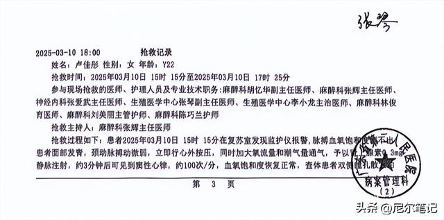 然而之後等待的三個小時裡,家屬多次詢問,醫生只是告知「正在蘇醒中」,沒有告知任何意外。