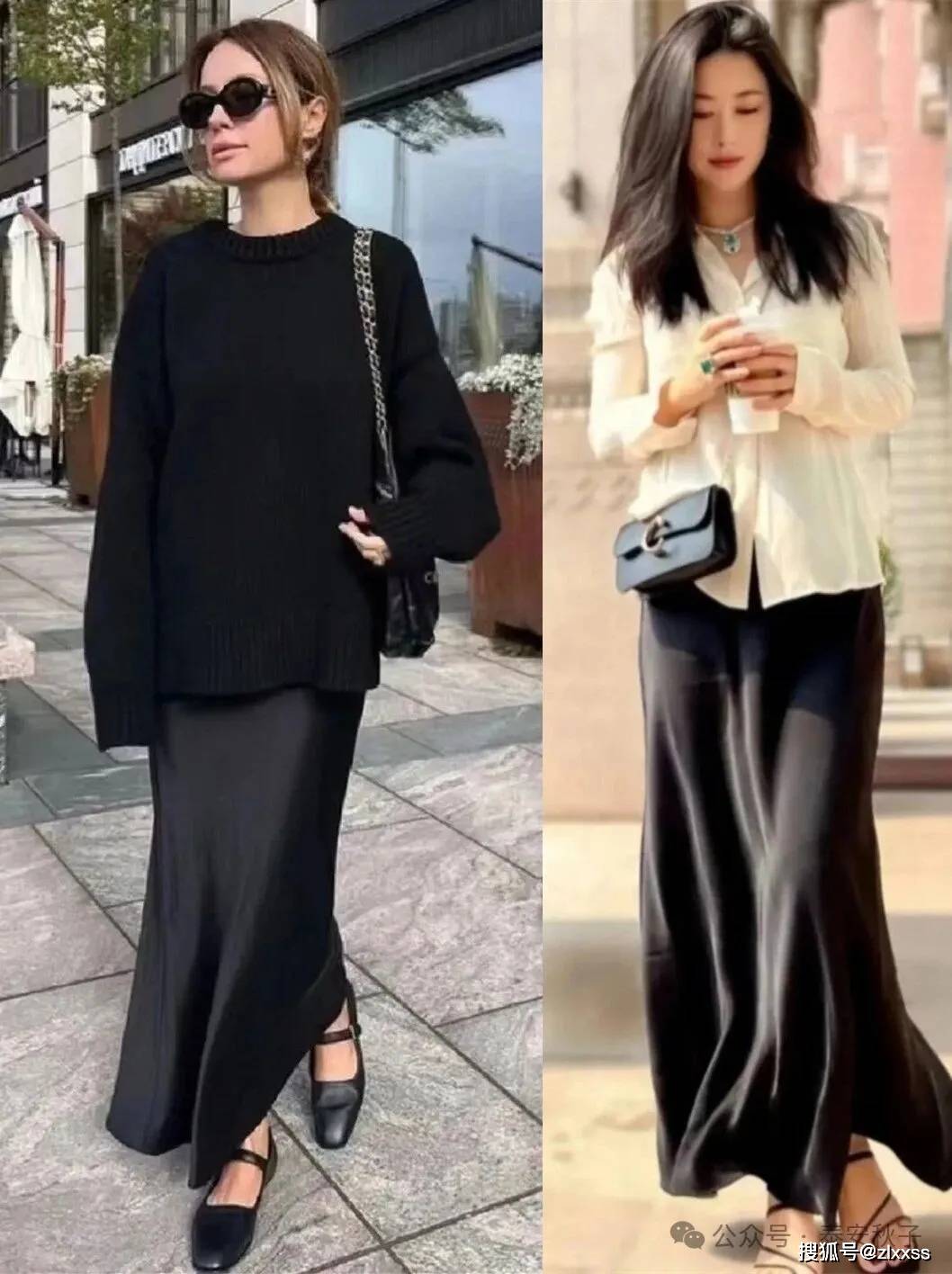黑色大毛衫看起來普通日常,但是質感與價格感,隨著緞面裙的加入瞬間就被激發出來,顯得輕盈又高級。