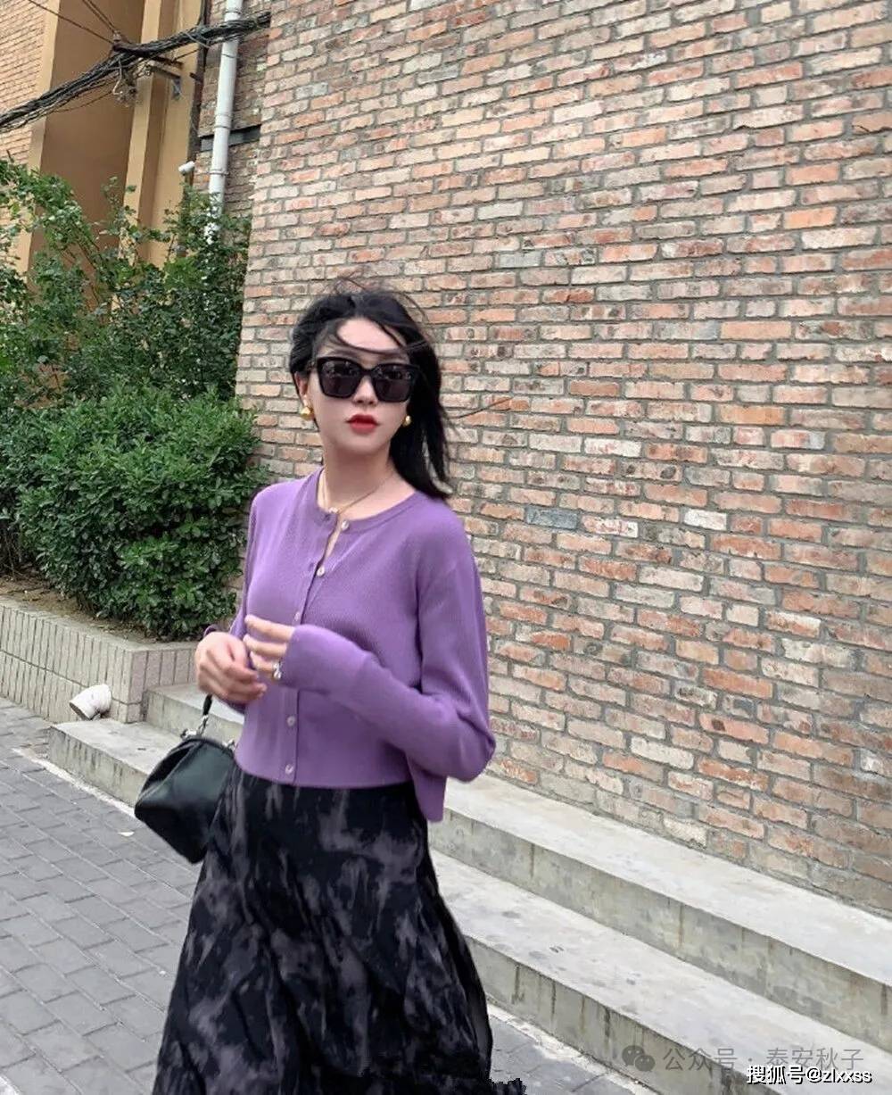 比如香芋紫色的羊毛開衫搭配黑色印花裙,簡約端莊又顯得青春,佩戴一款酷帥的墨鏡會讓整體風格更時髦。