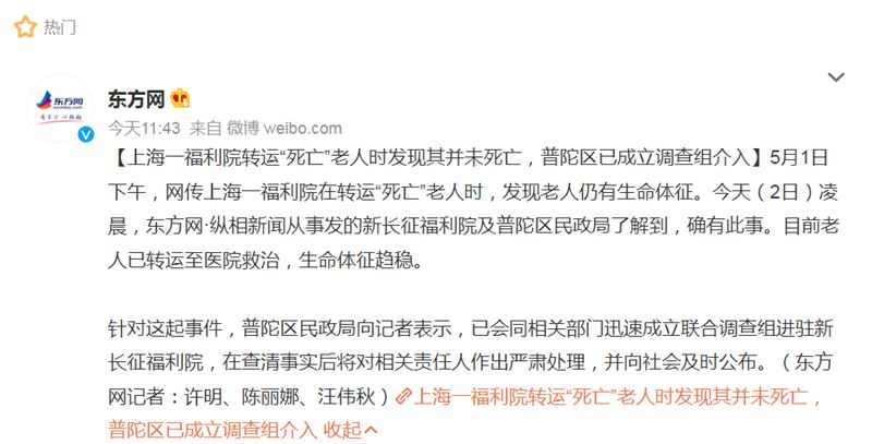 而根據《東方網》報導,上海市普陀區民政局也證實確有此事,差點誤被火化的長者,目前也已被轉移至醫院救治,生命體徵趨於穩定。而相關當局目前也已經會同相關部門迅速成立聯合調查小組,進駐事發的「新長征福利院」,並對涉事單位和相關責任人員祭出3項懲處...