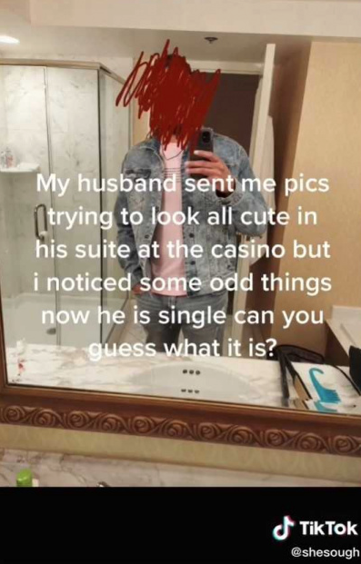 根據英國《鏡報》報導,最近又為ID為@shesough的抖音用戶在平台上傳了一段影片,並表示自己的丈夫獨自去賭場玩時,在飯店的浴室拍了幾張自拍給她報平安,但沒想到眼尖的她卻意外看到浴室裡面出現「很母湯的東西」直接抓包老公跟小三在飯店偷來款曲的證據!