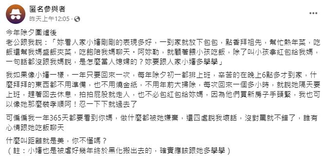 其他網友也酸:「男人自己腦袋不全,先讓他問問自己有本事,再來說話。」、「跟我老公嫂子一樣,我要是妳,明年不會出現在婆家吃年夜飯,討厭聽老公嫌東嫌西,不知感恩。」、「根本是豬隊友言論。」原PO也回應,小嬸家房子的頭期款、是娘家幫忙出的,寫的是小叔小嬸名字,自己在婆家如此被對待,老公跟她回娘家,卻被當大爺伺候,處境完全不同。