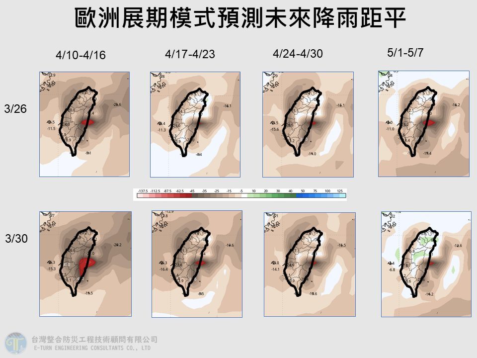 下週一時,第三波鋒面接力來襲,中部以北再現陣雨或雷雨,其他地區也有局部短暫陣雨機率。氣象專家賈新興分析指出,下週二、三鋒面雨勢才會逐漸減弱,整體天氣轉為多雲時晴,白天氣溫再度回暖偏熱。
