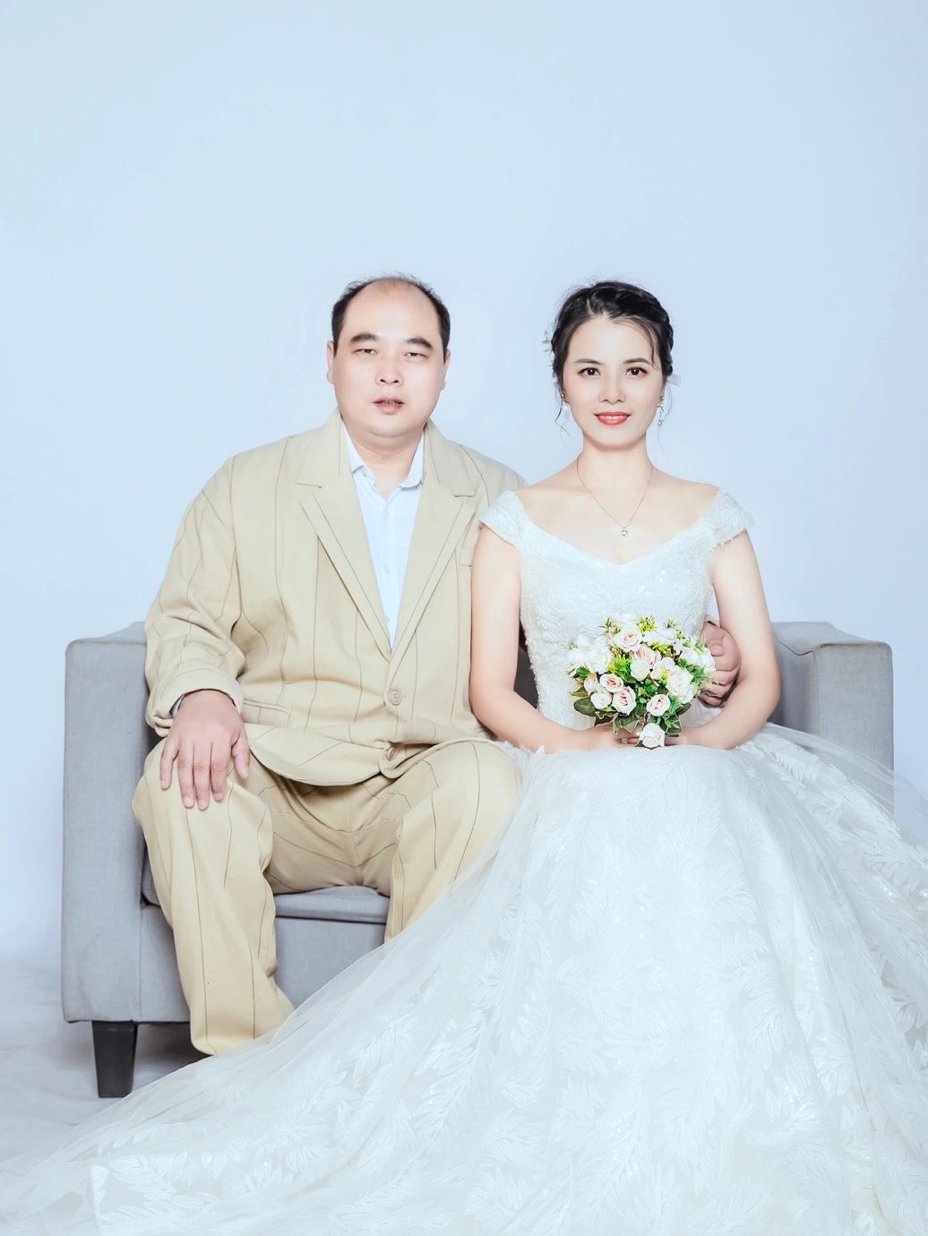只見照片中的老公頭髮稀疏、頭頂近乎全禿,整個人身形也較為肥胖,新娘則是濃眉大眼的美人,兩人坐在一起看起來顏值差異極大,看起來真的很像「美女與野獸」出現在真實世界...
