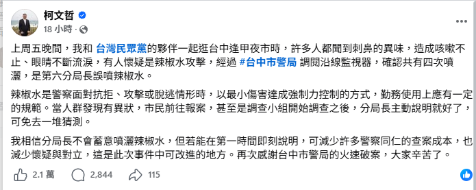 快訊/大逆轉!柯文哲遭噴辣椒水「兇手竟然是他」 Elmo 2026-04-21 檢舉 分享到 Facebook 豈料下午案情急轉直下,真相曝光後所有人都傻眼了。原來當天是分局長周俊銘在測試有問題的辣椒水噴霧器,因為操作失誤才導致這場誤會。網友得知後紛紛留言:「這也太瞎了吧」、「警察自己搞烏龍還讓人誤會」、「分局長出包也是挺扯的」、「難怪查不到可疑人士」、「這劇本根本想不到」。警方依照相關規定將周俊銘記過兩次,並調任非主管職務。圖片來源:《三立新聞網》 Advertisements 圖片來源:柯文哲臉書影片來源:TVBS NEWS資料來源:《TVBS》 Advertisements 回首頁 2/2 Advertisements 猜你會喜歡 快訊/高嘉瑜「驚傳參選市長」!親上火線回應了 民進黨拍板了!2政壇大將「確定參選市長」 快訊/本來在拚連任!知名議員「驚傳過世」 編輯精選推薦 More + 24歲兒失明!于美人爆「他在飯店掃廁所」維生 不盼紅包只求「別再花我的錢」 台灣大咖病逝「享壽83歲」!周遊告別式痛哭「認婚內出軌」:兒子很恨我... 離婚11年!洪榮宏愛女結婚「終破冰前妻」 「2爸爸牽她進場」催淚畫面曝 以為只是小感冒!本土女星悲痛證實「他併發肺炎過世」 一度淚灑現場「後悔同意插管」 演藝工作不做了?60歲綜藝一哥「被目擊改行開公車」 上路1狀況「遭黃鐙輝狂酸」:在家休息就好 本土劇女星生了!7年前凍卵「終於來到我身邊」 歌手尪嗨喊:生個足球隊 晚年隱居台東!68歲名主持失蹤「車內身亡」 伴侶悲曝「死前做1事」:還掛念著我 有望超越輝達!這公司「撿到大砲」將成最賺錢公司 最新/賈靜雯深夜慟曝「她已離世」 淚PO合照喊:真的好愛你... 65歲男星獨居暴斃!大咖女星放下恩怨「送前夫最後一程」 昔遭動手6年嘆「死者為大」 婚變尪落跑!單親媽「獨扛千萬債養孩」到處躲黑道 「一開口驚艷眾人」熬成台灣歌后 快訊/台灣旅行團赴中「1死12傷」!陸委會緊急發聲 22歲愛女病逝!資深男星「走不出喪女痛」留白長髮現身 掛骨灰項鍊「代女做1事」惹淚 趕在40歲前閃婚!八點檔女星「宣布嫁給他」 尪驚人身分曝「媒人是柯叔元」 快訊/49歲王俐人無預警宣布「加入成人平台」 千萬起家厝賣掉了!張秀卿認手頭緊「為女兒月花20萬」 她超爭氣「進軍美國」成台灣之光 85歲失智父身亡!林葉亭突宣布「皈依佛門」 遇大師「開示一番話」忍不住淚崩 44歲許維恩罹乳癌!醫示警「3日常用品」易致癌:別碰才能保命 45歲本土劇男星「驚曝已婚16年」! 首吐婚姻狀況「愛女是名校學霸」 送別亡夫3年!丁強遺孀「不投靠美國兒女」 獨留台灣「76歲拒健康檢查」原因曝光 空窗多年!68歲陳美鳳突羞認「身邊有個他」 40年前就認識「遭男方母親拆散」 怕電費爆表!他堅持「睡前冷氣定時」只吹2小時 一票內行人「曝省電撇步」爽爽吹整晚 功德圓滿了!台語歌后「悲曝他離世」享壽95歲 淚喊:去當快樂的神仙吧... 86歲蕭萬長「逆轉肺癌」!秘訣竟是「靠1碗養生湯」每周喝4次:快速清毒素 台語歌后慟別摯愛!告別式上認「早隱瞞病情」 道歉哭喊:原諒我簽放棄急救