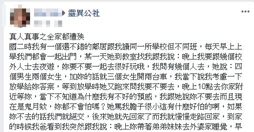 後來原PO的爸爸晚上突然說「晚上妳帶著弟妹們去外婆家睡覺,早上再請舅舅載你們上課」,所以原PO還是拒絕了夜遊邀請,沒想到隔天卻從同學口中得知小惠昨天晚上走了,她急忙去向小惠的哥哥求證,小惠的哥哥只難過說「是真的,昨晚跟人出去夜遊,整台車衝進去魚塭裡,車上兩男一女全走了,另一台車撞電線杆駕駛當下也沒呼吸心跳,乘客一個傷勢嚴重,另一個沒事。」,讓原PO當場放聲大哭。