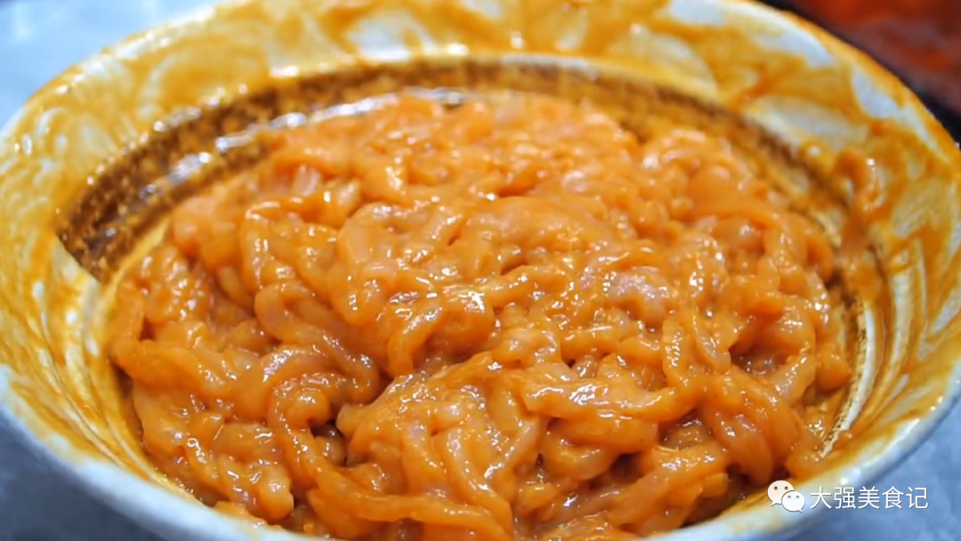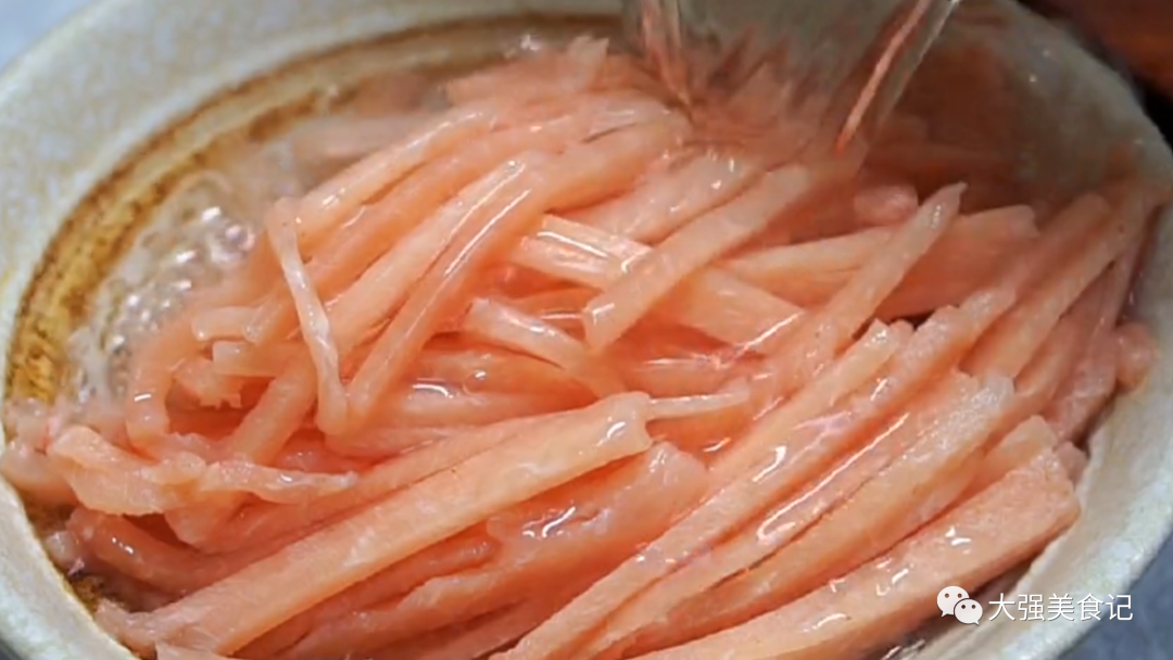 切肉絲我們最好選用裡脊肉,放冰箱稍微凍一下,然後先切片,再切絲。切好的肉絲里加入清水,再把水分擠乾,