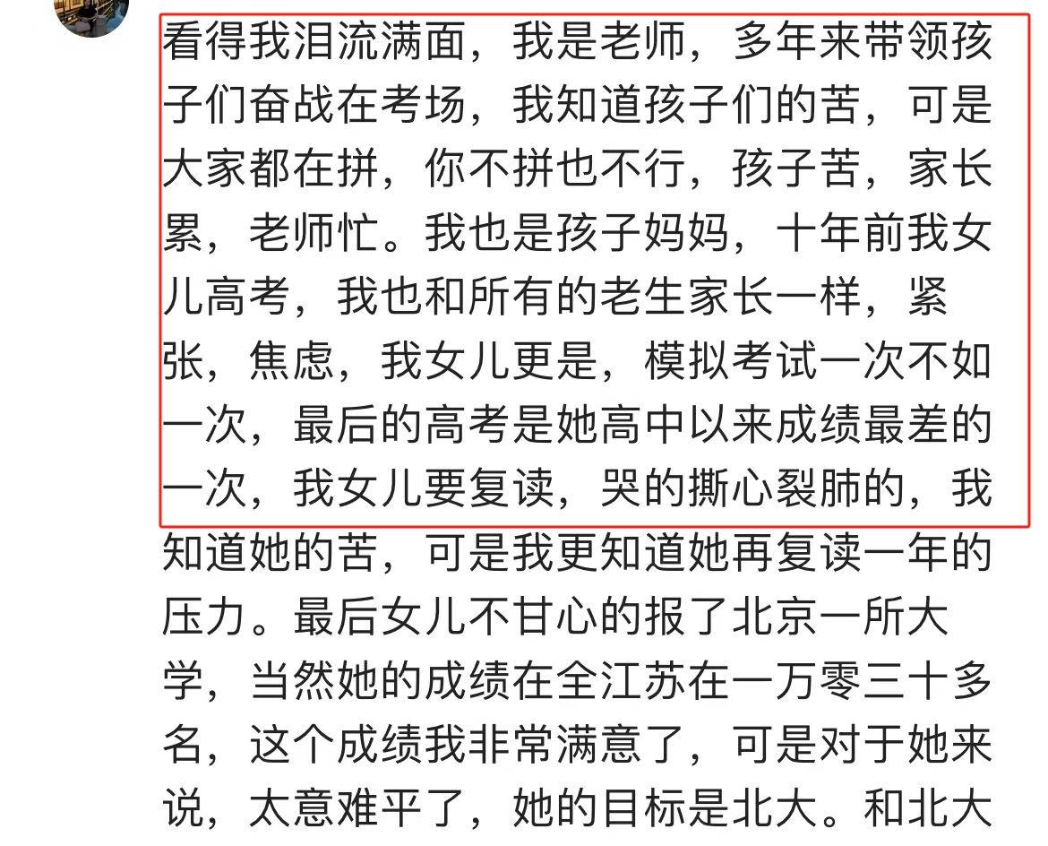 另一位網友說:「我是老師,特別理解孩子的辛苦,女兒高考的時候也非常累,成績出來不理想,哭得撕心裂肺,就是對自己要求太高了,所以會付出很多努力。」