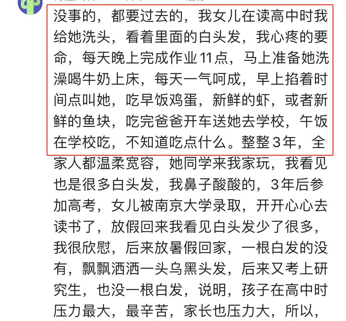還有一位網友說:「我女兒讀高中的時候,經常熬夜到深夜,看著裡面的白頭髮,我非常心疼,但家長能做的不多,只能好好照顧生活。」