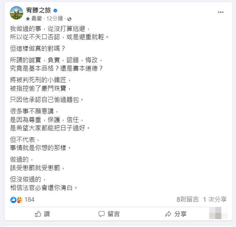 據《ETtoday》報導,宥勝前陣子被爆料,對3名女子性騷擾,對方的控訴中,各種行為歷歷在目,宥勝的妻子似乎也知道,讓外界得知後一片譁然,而台北地檢署在經過調查後,也對他起訴強制猥褻罪,全案正在審理當中;而消失一陣子的他,突然在臉書提到「選擇坦白,堅持誠實,是不是錯?」讓不少人認為,他根本不是有心悔改,不過也有粉絲支持他,引發一片論戰。