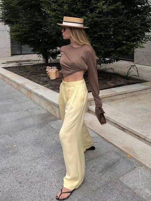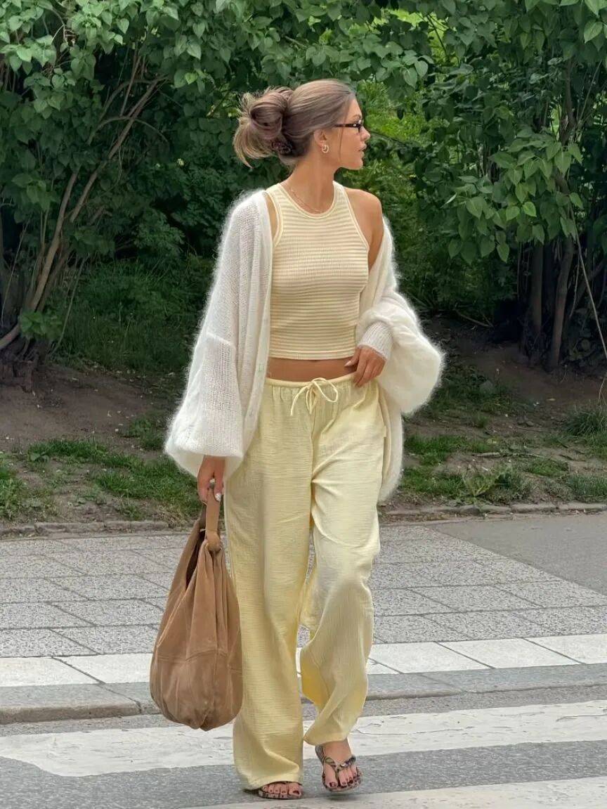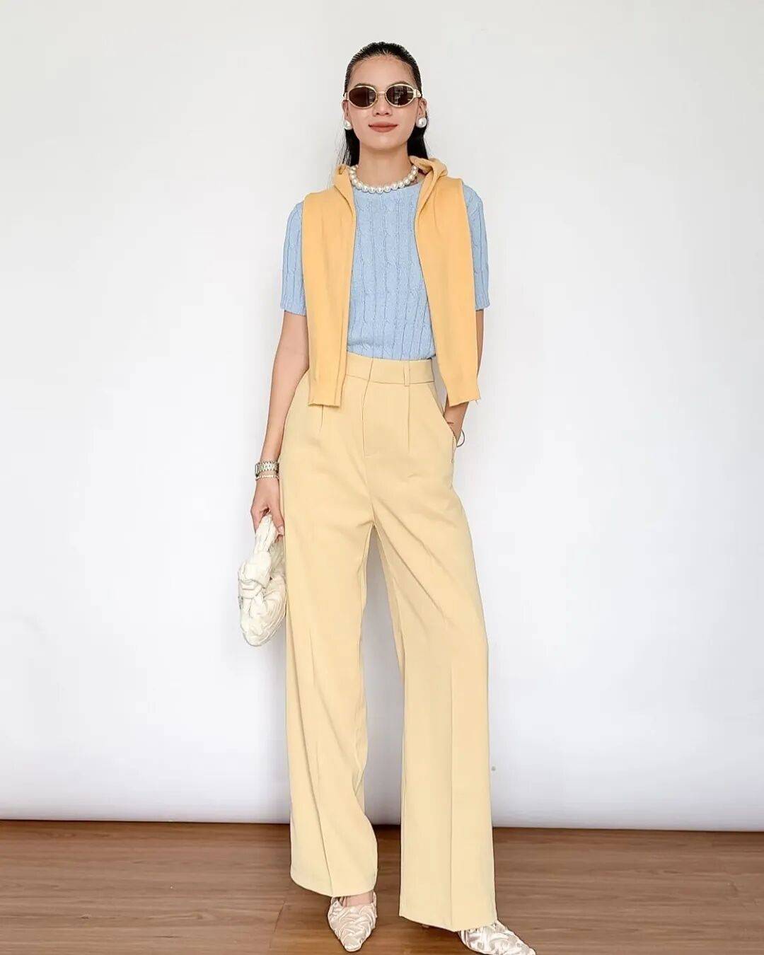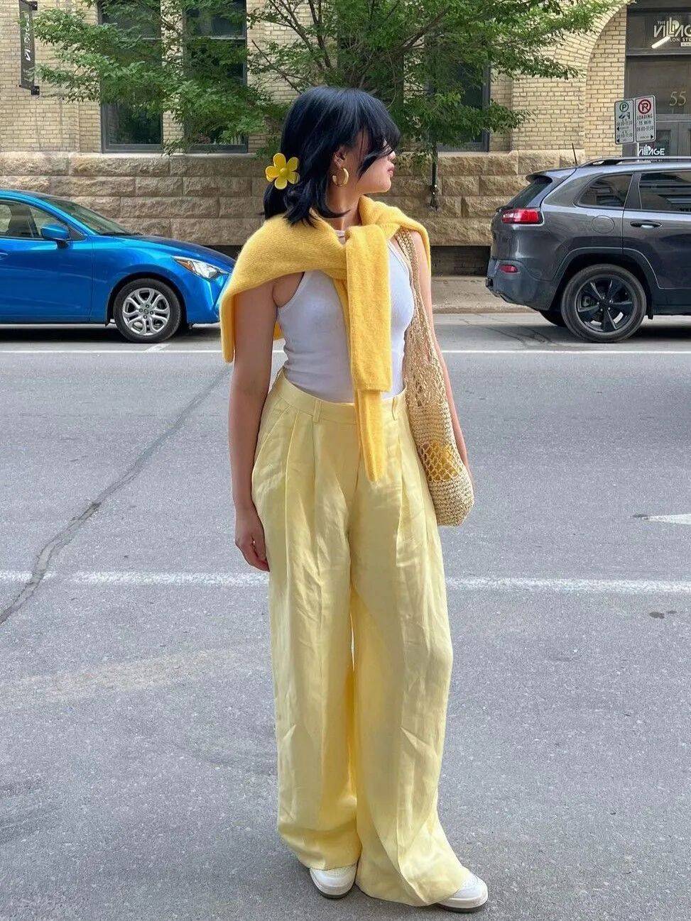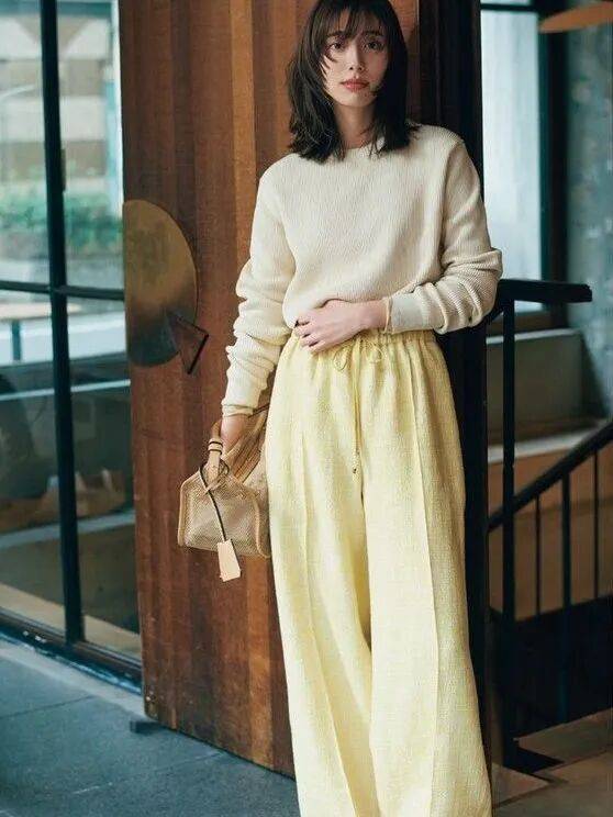 有搭配力的時髦精,可以把香草黃寬褲穿得很有層次亮點,哪怕只是看似輕鬆隨意的基礎品,都能感受到一抹慵懶、度假的氛圍。