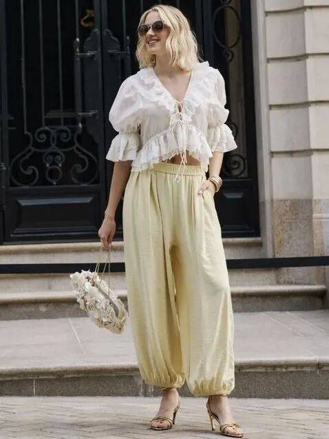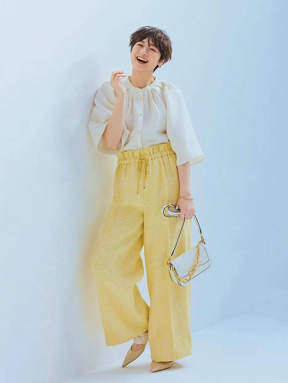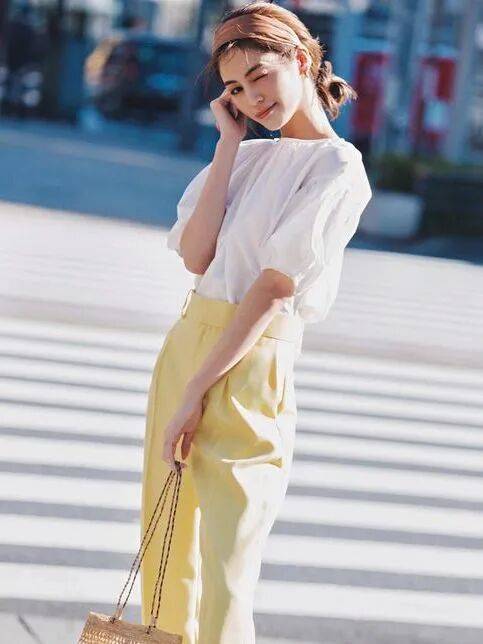 香草奶油黃寬褲不像純白色那般小心翼翼,飽和度也非常柔和百搭,搭配白色泡泡袖襯衫,在自然光的折射下,顯得愈發明媚動人。