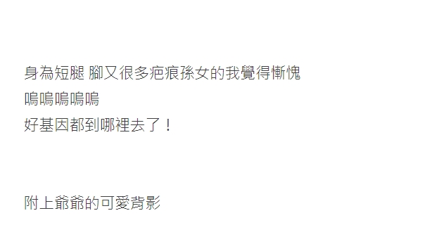 據《中時新聞網》報導,有網友在社群平台「Dcard」發文說,偶然看到阿公的腿照後太驚艷,撇開指甲有點斑駁、剝落的樣子,阿公皮膚實在非常光滑,雖然部分地方有點小黑斑,但是整體看上去水嫩白亮,尤其幾乎一點皺紋都沒有,幾乎跟網美的腿差不多,但是相比之下,自己的腿比例偏短,加上又有很多痕跡,忍不住慚愧:「這麼好基因到底都到哪裡去了?」