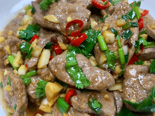 4、把調好的料汁倒進豬肝中,撒上一小把香菜提味,再加食鹽、白糖、生抽、蠔油和米醋攪拌均勻,嫩滑爽口、好吃又下飯涼拌豬肝就做好了。