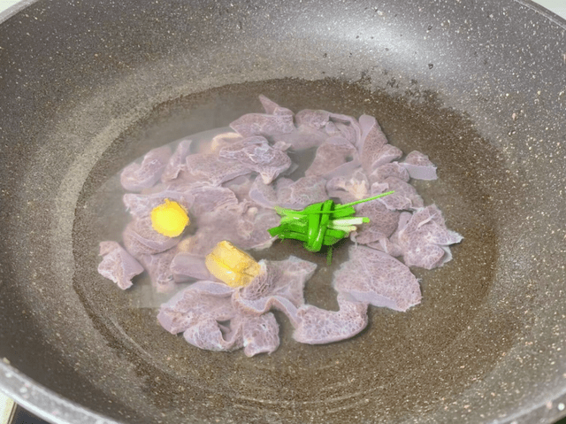 2、控乾水分的豬肝放進碗中,加入食鹽、胡椒粉、蛋清和澱粉抓勻,腌制十分鐘。這裡要注意豬肝中的水分一定要控乾,要不調料味會腌不進去。然後鍋中加水燒開,放入蔥段、薑片和料酒,之後倒入豬肝把火調小,水似開非開的狀態把肝養熟,一定不要大火,看到豬肝變色斷生後,趕緊撈出來,不要煮老了。