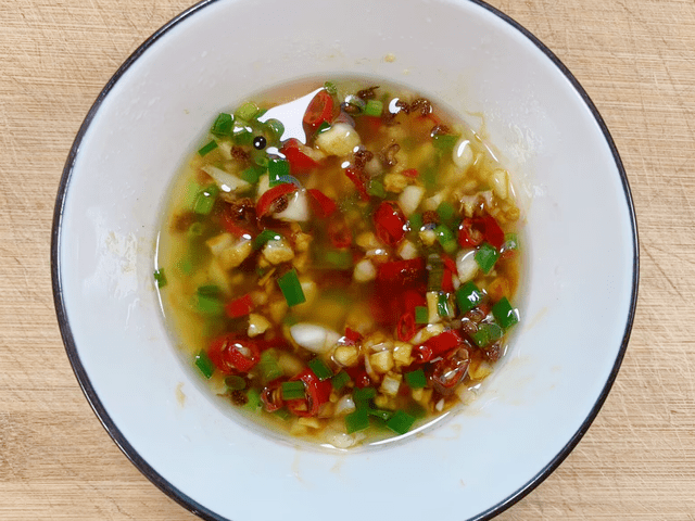 3、接下來調一碗涼拌汁 。準備青椒碎、蒜末、小米辣和蔥末放入小碗中。然後鍋中把油燒熱,撒入花椒粒炸香,再把花椒粒揀出來棄用,接著把製作好的花椒油倒在碗中,把調料炸出香味。