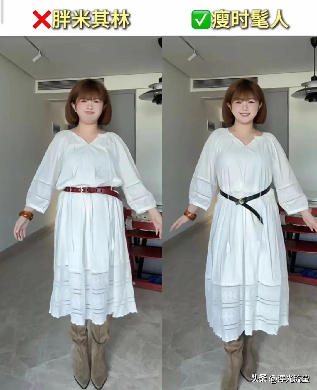 另外,不同身材的姐妹系腰帶的方式也不一樣,小個子姐妹一定要把腰線提高,盡量系在肚臍以上的位置,這樣能最大程度地拉長腿部比例,顯得更高。