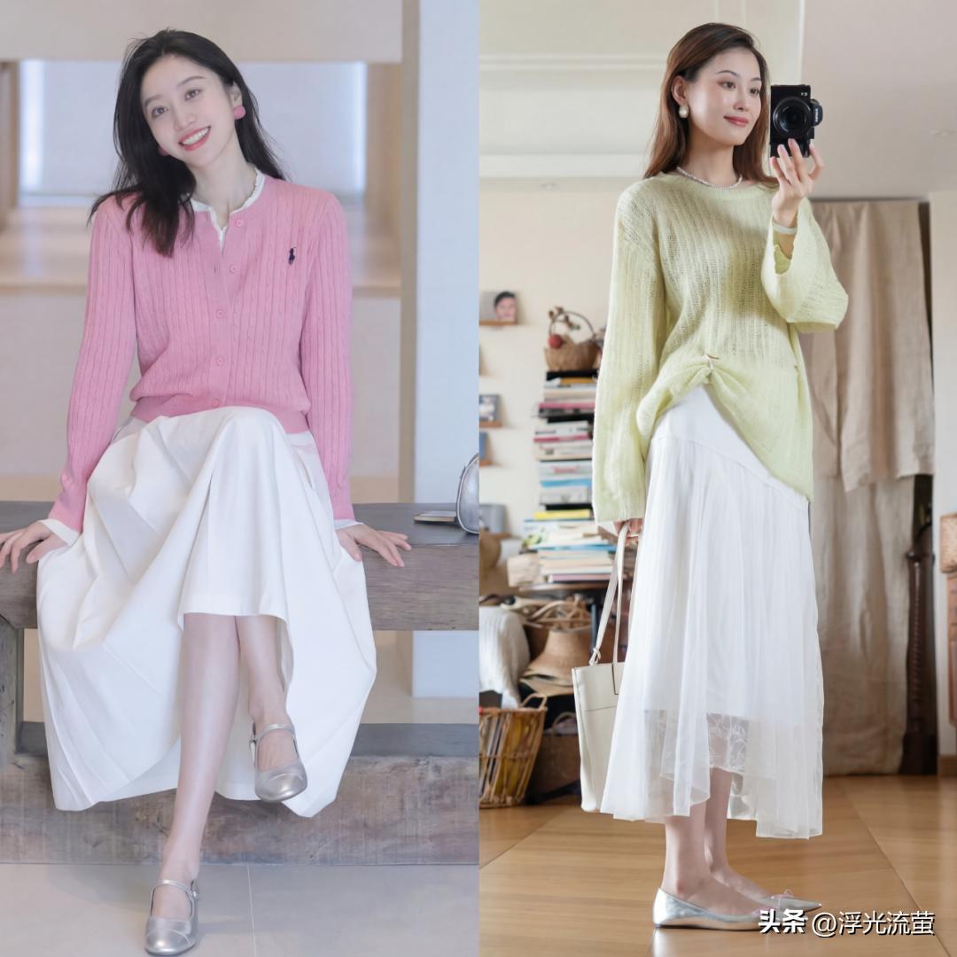 搭配「初戀裙」的外套,優先選輕薄款,比如針織開衫,軟糯的針織材質和初戀裙的溫柔感完美契合,好看又減齡。