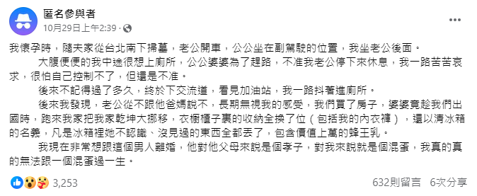 網友看完後紛紛心疼留言:「真的是愚孝無誤,這種人真的不適合當另一半乖乖回媽媽懷裡喝奶吧」、「就直接說再不停讓我上廁所我就要尿在你車上了喔!看他停不停」、「趕快逃吧,愚孝最可怕」、「不讓妳下車上廁所算是家暴虐待的一種吧」、「人生短短,是我不會忍,你懷孕都不護你,我不信生完會對你好」、「有種一點直接尿車上,東西不見就報警竊盜」、「孕婦本來就很容易頻尿,一直要孕婦忍是有事」。