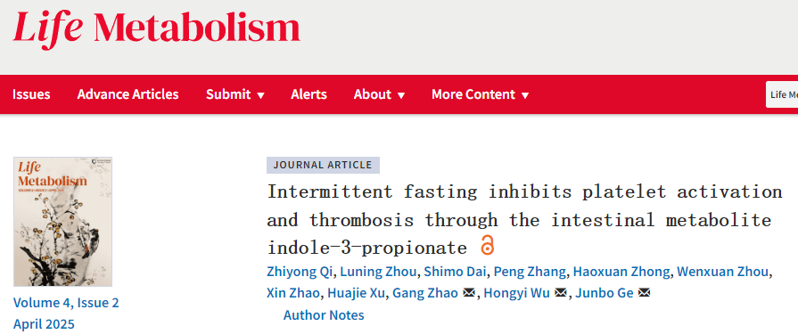 2025年2月,復旦大學附屬中山醫院葛均波院士等、在《生命代謝》期刊上發表的一項研究發現:適當的輕斷食不僅能讓人更健康,還能降低血小板的「活躍度」,減少血栓形成的風險。研究人員讓一些冠狀動脈疾病患者「嘗試了10天輕斷食」(間歇性禁食),也就是「吃吃停停」的飲食方式,結果發現,這些患者的血小板變得不那麼「活躍」,不易聚集形成血栓。