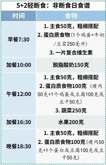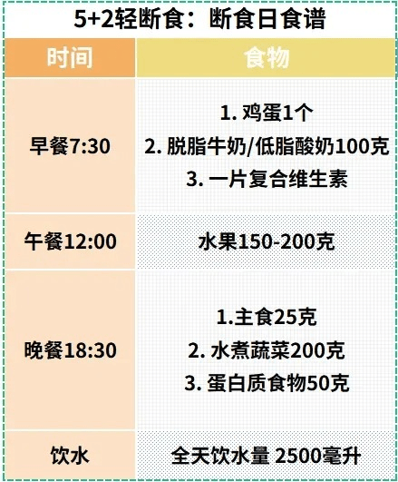 北京協和醫院臨床營養科主任醫師陳偉、曾發文給出了「5+2輕斷食」的具體食譜,陳偉醫生提醒,「5+2輕斷食」不是什麼都不吃,而是限制食物的攝入量,四大類營養素中微量營養素、碳水化合物、脂肪和蛋白質都要按比例攝入。非斷食日適當控制熱量攝入,女性推薦總熱量為1200-1500千卡/天,男性為1500-1800千卡/天,非斷食日根據比例自行搭配調整。