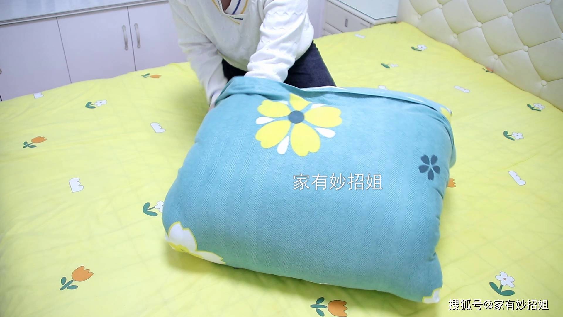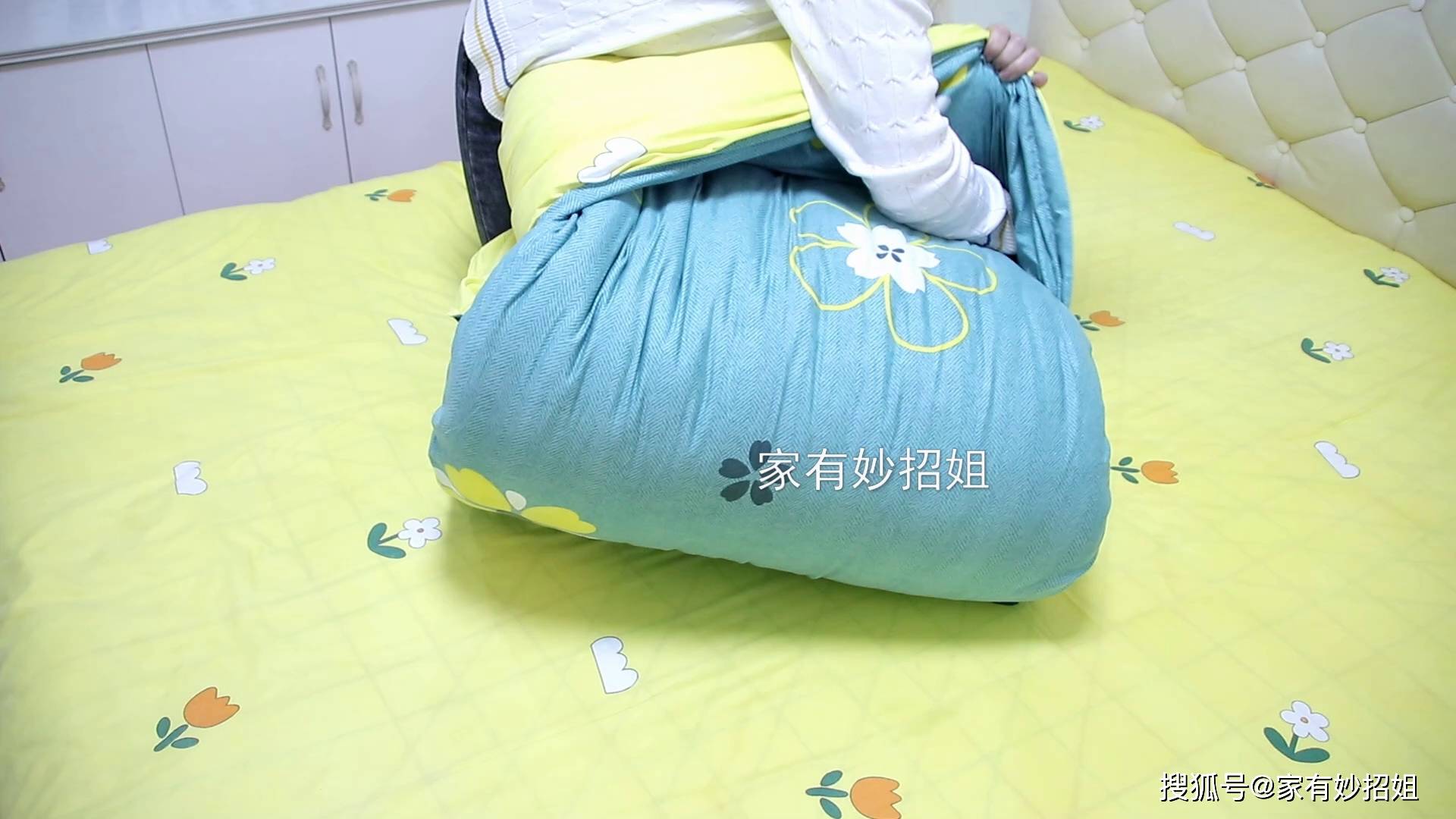 接下來我們把被子翻到另一面,就會發現,剛剛往裡摺疊部分的被子,就形成了一個口袋,我們只需將手伸入口袋的底端,然後抓住剩餘的被子,將口袋往外翻。