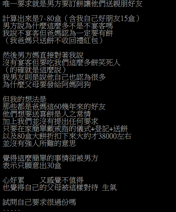 女網友表示,當時要求未婚夫訂購喜餅,消息傳到準婆婆的耳中時,對方直接大聲咆哮,質疑:「沒有宴客但要吃我們這麼多餅?我會笑翻喔!」讓她好錯愕,更忍不住抱怨,這些親友都是爸媽60多年來的好友,嫁女兒總是要知會一下吧?更何況整場婚禮:「只要在家簡單戴戒指的儀式、登記、送餅,80盒大餅折扣下來大約才38000左右,並沒有強人所難的意思!」