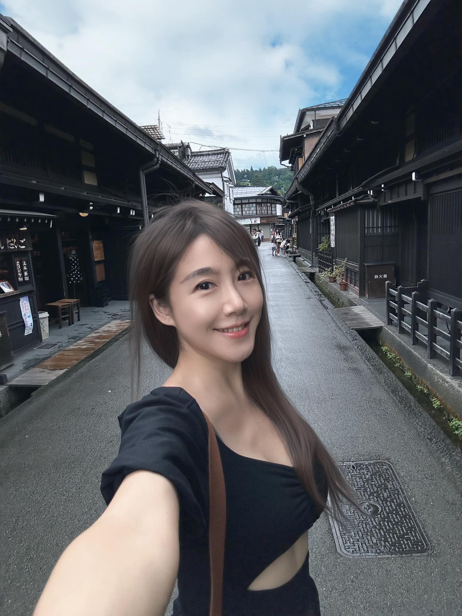 只見她頂著一頭長髮,身穿黑色低胸露肚洋裝,若隱若現展現好身材,對鏡頭擺出甜美笑容,後面是日本古色古香的街道,然而看似平常的照片,卻暗藏玄機,只見她逐漸將照片放大,身後穿紅衣的女子有張奇怪的臉,五官扭曲、眼神空洞,離奇外貌不像人臉,乍看之下相當嚇人,分享美照時也貼心喊話:「半夜不要放大來看後面......」