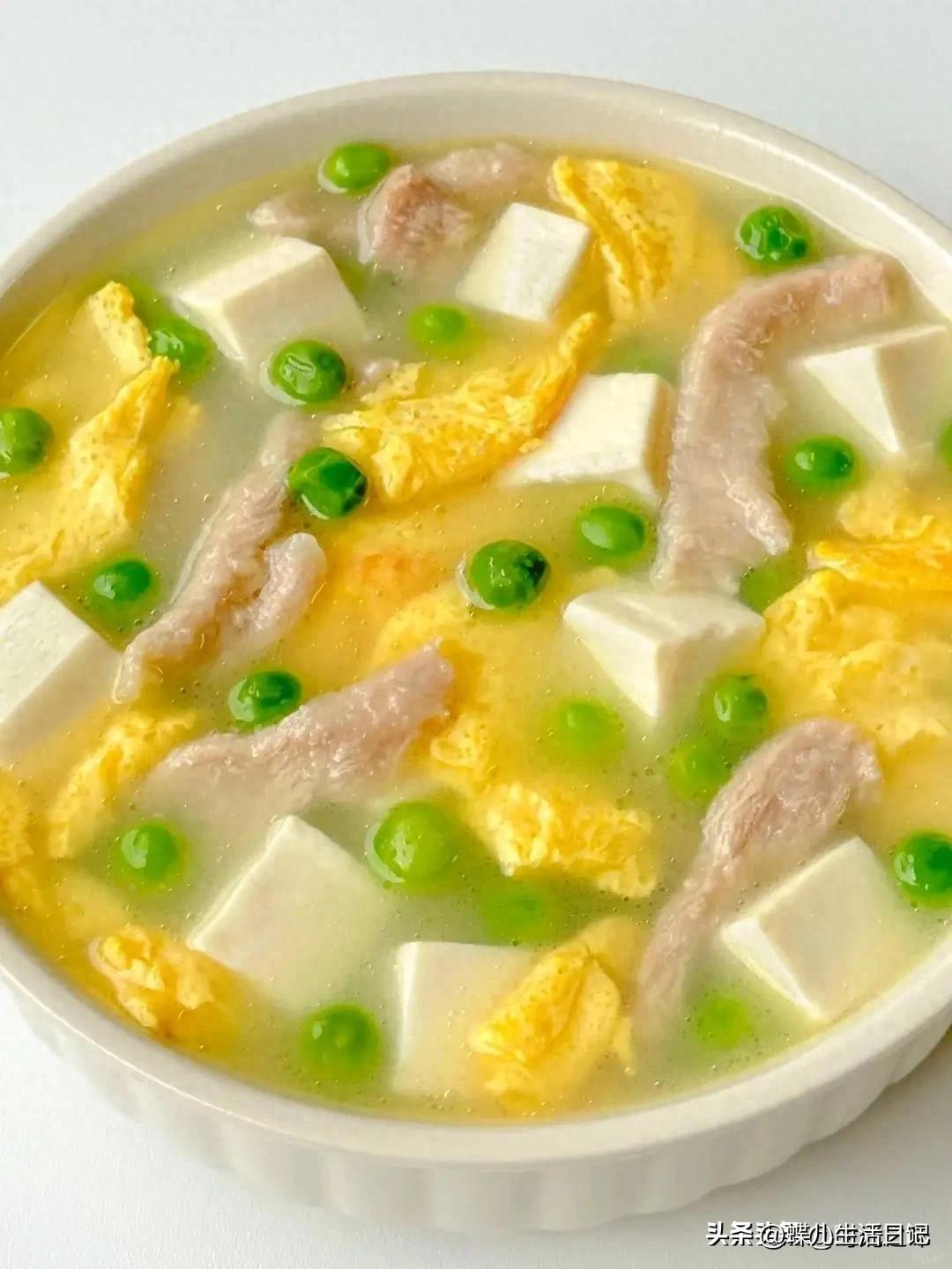 豌豆鮮嫩,豆腐軟滑,肉片鮮香,這道湯清淡不膩,潤口又好喝。