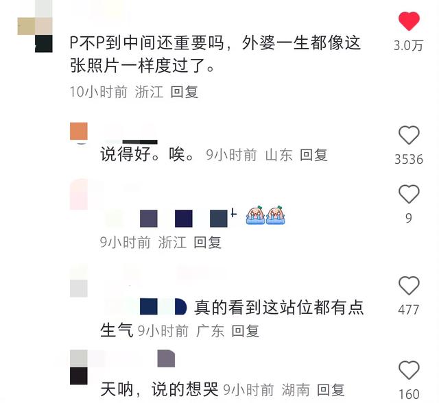 首先,他們安排了四個長凳子,外公坐在第一排中間,兩個大兒子坐在外公左右側,後面三個凳子、也都是男性坐。其次,女性是在最後一排站著,外婆則是被安排到第三排的最左邊,顯得格格不入。看到這一張全家福,女孩越看越覺得心酸,於是,她尋求廣大網友們幫忙:「有大神可以幫忙把外婆、修圖到第一排中間位置嗎?」怎料,留言區的網友都在紛紛議論:「p不p到中間重要嗎?外婆這一生都像這張照片一樣度過了。」、「但凡家裡有個正常人,都不會讓老太太坐在最邊邊。」、「多不孝順的家庭,才能拍這種照片啊!」