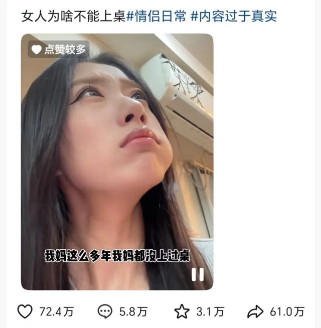 還有的網友說,她家有規定,女性是不能上桌吃飯的,包括她媽媽。家裡來親戚時,媽媽從清晨就開始忙碌,其他人都坐在客廳吃瓜子閒聊,只有媽媽一直在廚房連軸轉。大家都坐滿了,卻沒有給做飯的媽媽留位置,媽媽只能一臉無奈地說:「沒事沒事,你們吃你們的,我去廚房吃!」這一道道飯菜,都是媽媽一手炒出來的,可媽媽卻吃不到幾口,飯後還得獨自收拾殘局。然而,這不僅是她媽媽的遭遇,還有她奶奶…